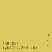 Цвет #DBC85F в цветовой модели RGB обозначается тремя октетами (219, 200, 95) в десятичном формате и #DBC85F в шестнадцатиричном (hex) формате, которые являются интенсивностью красного 219 (hex DB), интенсивность зелёного 200 (hex C8) и интенсивность синего 95 (hex 5F).