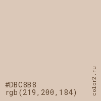 Цвет #DBC8B8 в цветовой модели RGB обозначается тремя октетами (219, 200, 184) в десятичном формате и #DBC8B8 в шестнадцатиричном (hex) формате, которые являются интенсивностью красного 219 (hex DB), интенсивность зелёного 200 (hex C8) и интенсивность синего 184 (hex B8).