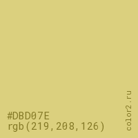 Цвет #DBD07E в цветовой модели RGB обозначается тремя октетами (219, 208, 126) в десятичном формате и #DBD07E в шестнадцатиричном (hex) формате, которые являются интенсивностью красного 219 (hex DB), интенсивность зелёного 208 (hex D0) и интенсивность синего 126 (hex 7E).