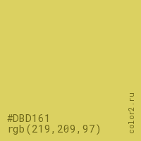 Цвет #DBD161 в цветовой модели RGB обозначается тремя октетами (219, 209, 97) в десятичном формате и #DBD161 в шестнадцатиричном (hex) формате, которые являются интенсивностью красного 219 (hex DB), интенсивность зелёного 209 (hex D1) и интенсивность синего 97 (hex 61).