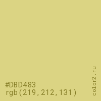 Цвет #DBD483 в цветовой модели RGB обозначается тремя октетами (219, 212, 131) в десятичном формате и #DBD483 в шестнадцатиричном (hex) формате, которые являются интенсивностью красного 219 (hex DB), интенсивность зелёного 212 (hex D4) и интенсивность синего 131 (hex 83).