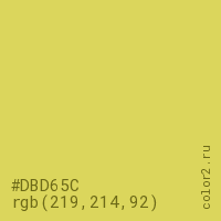Цвет #DBD65C в цветовой модели RGB обозначается тремя октетами (219, 214, 92) в десятичном формате и #DBD65C в шестнадцатиричном (hex) формате, которые являются интенсивностью красного 219 (hex DB), интенсивность зелёного 214 (hex D6) и интенсивность синего 92 (hex 5C).