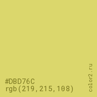 Цвет #DBD76C в цветовой модели RGB обозначается тремя октетами (219, 215, 108) в десятичном формате и #DBD76C в шестнадцатиричном (hex) формате, которые являются интенсивностью красного 219 (hex DB), интенсивность зелёного 215 (hex D7) и интенсивность синего 108 (hex 6C).