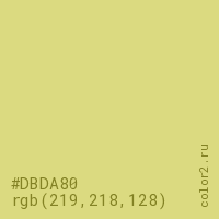 Цвет #DBDA80 в цветовой модели RGB обозначается тремя октетами (219, 218, 128) в десятичном формате и #DBDA80 в шестнадцатиричном (hex) формате, которые являются интенсивностью красного 219 (hex DB), интенсивность зелёного 218 (hex DA) и интенсивность синего 128 (hex 80).