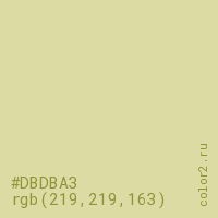 Цвет #DBDBA3 в цветовой модели RGB обозначается тремя октетами (219, 219, 163) в десятичном формате и #DBDBA3 в шестнадцатиричном (hex) формате, которые являются интенсивностью красного 219 (hex DB), интенсивность зелёного 219 (hex DB) и интенсивность синего 163 (hex A3).