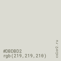 Цвет #DBDBD2 в цветовой модели RGB обозначается тремя октетами (219, 219, 210) в десятичном формате и #DBDBD2 в шестнадцатиричном (hex) формате, которые являются интенсивностью красного 219 (hex DB), интенсивность зелёного 219 (hex DB) и интенсивность синего 210 (hex D2).