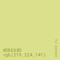 Цвет #DBE08D в цветовой модели RGB обозначается тремя октетами (219, 224, 141) в десятичном формате и #DBE08D в шестнадцатиричном (hex) формате, которые являются интенсивностью красного 219 (hex DB), интенсивность зелёного 224 (hex E0) и интенсивность синего 141 (hex 8D).