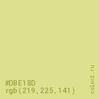 Цвет #DBE18D в цветовой модели RGB обозначается тремя октетами (219, 225, 141) в десятичном формате и #DBE18D в шестнадцатиричном (hex) формате, которые являются интенсивностью красного 219 (hex DB), интенсивность зелёного 225 (hex E1) и интенсивность синего 141 (hex 8D).