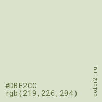 Цвет #DBE2CC в цветовой модели RGB обозначается тремя октетами (219, 226, 204) в десятичном формате и #DBE2CC в шестнадцатиричном (hex) формате, которые являются интенсивностью красного 219 (hex DB), интенсивность зелёного 226 (hex E2) и интенсивность синего 204 (hex CC).