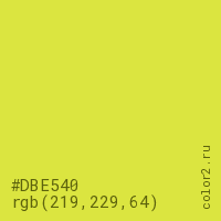Цвет #DBE540 в цветовой модели RGB обозначается тремя октетами (219, 229, 64) в десятичном формате и #DBE540 в шестнадцатиричном (hex) формате, которые являются интенсивностью красного 219 (hex DB), интенсивность зелёного 229 (hex E5) и интенсивность синего 64 (hex 40).