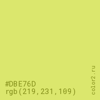 Цвет #DBE76D в цветовой модели RGB обозначается тремя октетами (219, 231, 109) в десятичном формате и #DBE76D в шестнадцатиричном (hex) формате, которые являются интенсивностью красного 219 (hex DB), интенсивность зелёного 231 (hex E7) и интенсивность синего 109 (hex 6D).