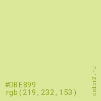 Цвет #DBE899 в цветовой модели RGB обозначается тремя октетами (219, 232, 153) в десятичном формате и #DBE899 в шестнадцатиричном (hex) формате, которые являются интенсивностью красного 219 (hex DB), интенсивность зелёного 232 (hex E8) и интенсивность синего 153 (hex 99).