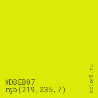 Цвет #DBEB07 в цветовой модели RGB обозначается тремя октетами (219, 235, 7) в десятичном формате и #DBEB07 в шестнадцатиричном (hex) формате, которые являются интенсивностью красного 219 (hex DB), интенсивность зелёного 235 (hex EB) и интенсивность синего 7 (hex 07).