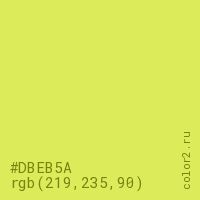 Цвет #DBEB5A в цветовой модели RGB обозначается тремя октетами (219, 235, 90) в десятичном формате и #DBEB5A в шестнадцатиричном (hex) формате, которые являются интенсивностью красного 219 (hex DB), интенсивность зелёного 235 (hex EB) и интенсивность синего 90 (hex 5A).