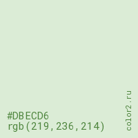 Цвет #DBECD6 в цветовой модели RGB обозначается тремя октетами (219, 236, 214) в десятичном формате и #DBECD6 в шестнадцатиричном (hex) формате, которые являются интенсивностью красного 219 (hex DB), интенсивность зелёного 236 (hex EC) и интенсивность синего 214 (hex D6).