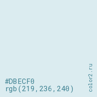 Цвет #DBECF0 в цветовой модели RGB обозначается тремя октетами (219, 236, 240) в десятичном формате и #DBECF0 в шестнадцатиричном (hex) формате, которые являются интенсивностью красного 219 (hex DB), интенсивность зелёного 236 (hex EC) и интенсивность синего 240 (hex F0).