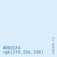 Цвет #DBECFA в цветовой модели RGB обозначается тремя октетами (219, 236, 250) в десятичном формате и #DBECFA в шестнадцатиричном (hex) формате, которые являются интенсивностью красного 219 (hex DB), интенсивность зелёного 236 (hex EC) и интенсивность синего 250 (hex FA).