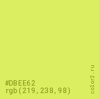 Цвет #DBEE62 в цветовой модели RGB обозначается тремя октетами (219, 238, 98) в десятичном формате и #DBEE62 в шестнадцатиричном (hex) формате, которые являются интенсивностью красного 219 (hex DB), интенсивность зелёного 238 (hex EE) и интенсивность синего 98 (hex 62).
