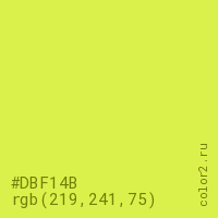 Цвет #DBF14B в цветовой модели RGB обозначается тремя октетами (219, 241, 75) в десятичном формате и #DBF14B в шестнадцатиричном (hex) формате, которые являются интенсивностью красного 219 (hex DB), интенсивность зелёного 241 (hex F1) и интенсивность синего 75 (hex 4B).