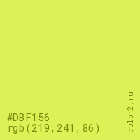 Цвет #DBF156 в цветовой модели RGB обозначается тремя октетами (219, 241, 86) в десятичном формате и #DBF156 в шестнадцатиричном (hex) формате, которые являются интенсивностью красного 219 (hex DB), интенсивность зелёного 241 (hex F1) и интенсивность синего 86 (hex 56).