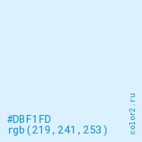 Цвет #DBF1FD в цветовой модели RGB обозначается тремя октетами (219, 241, 253) в десятичном формате и #DBF1FD в шестнадцатиричном (hex) формате, которые являются интенсивностью красного 219 (hex DB), интенсивность зелёного 241 (hex F1) и интенсивность синего 253 (hex FD).