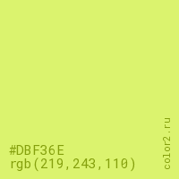 Цвет #DBF36E в цветовой модели RGB обозначается тремя октетами (219, 243, 110) в десятичном формате и #DBF36E в шестнадцатиричном (hex) формате, которые являются интенсивностью красного 219 (hex DB), интенсивность зелёного 243 (hex F3) и интенсивность синего 110 (hex 6E).