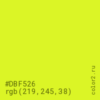 Цвет #DBF526 в цветовой модели RGB обозначается тремя октетами (219, 245, 38) в десятичном формате и #DBF526 в шестнадцатиричном (hex) формате, которые являются интенсивностью красного 219 (hex DB), интенсивность зелёного 245 (hex F5) и интенсивность синего 38 (hex 26).