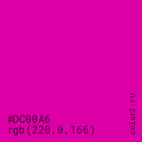 Цвет #DC00A6 в цветовой модели RGB обозначается тремя октетами (220, 0, 166) в десятичном формате и #DC00A6 в шестнадцатиричном (hex) формате, которые являются интенсивностью красного 220 (hex DC), интенсивность зелёного 0 (hex 00) и интенсивность синего 166 (hex A6).
