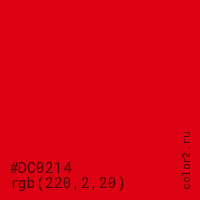 Цвет #DC0214 в цветовой модели RGB обозначается тремя октетами (220, 2, 20) в десятичном формате и #DC0214 в шестнадцатиричном (hex) формате, которые являются интенсивностью красного 220 (hex DC), интенсивность зелёного 2 (hex 02) и интенсивность синего 20 (hex 14).