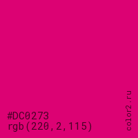 Цвет #DC0273 в цветовой модели RGB обозначается тремя октетами (220, 2, 115) в десятичном формате и #DC0273 в шестнадцатиричном (hex) формате, которые являются интенсивностью красного 220 (hex DC), интенсивность зелёного 2 (hex 02) и интенсивность синего 115 (hex 73).