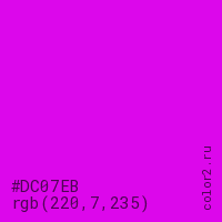Цвет #DC07EB в цветовой модели RGB обозначается тремя октетами (220, 7, 235) в десятичном формате и #DC07EB в шестнадцатиричном (hex) формате, которые являются интенсивностью красного 220 (hex DC), интенсивность зелёного 7 (hex 07) и интенсивность синего 235 (hex EB).