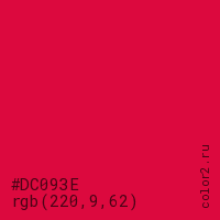 Цвет #DC093E в цветовой модели RGB обозначается тремя октетами (220, 9, 62) в десятичном формате и #DC093E в шестнадцатиричном (hex) формате, которые являются интенсивностью красного 220 (hex DC), интенсивность зелёного 9 (hex 09) и интенсивность синего 62 (hex 3E).