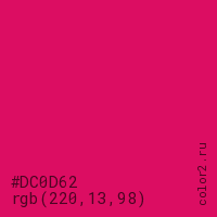 Цвет #DC0D62 в цветовой модели RGB обозначается тремя октетами (220, 13, 98) в десятичном формате и #DC0D62 в шестнадцатиричном (hex) формате, которые являются интенсивностью красного 220 (hex DC), интенсивность зелёного 13 (hex 0D) и интенсивность синего 98 (hex 62).