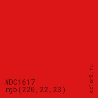 Цвет #DC1617 в цветовой модели RGB обозначается тремя октетами (220, 22, 23) в десятичном формате и #DC1617 в шестнадцатиричном (hex) формате, которые являются интенсивностью красного 220 (hex DC), интенсивность зелёного 22 (hex 16) и интенсивность синего 23 (hex 17).
