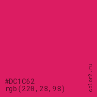 Цвет #DC1C62 в цветовой модели RGB обозначается тремя октетами (220, 28, 98) в десятичном формате и #DC1C62 в шестнадцатиричном (hex) формате, которые являются интенсивностью красного 220 (hex DC), интенсивность зелёного 28 (hex 1C) и интенсивность синего 98 (hex 62).