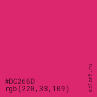 Цвет #DC266D в цветовой модели RGB обозначается тремя октетами (220, 38, 109) в десятичном формате и #DC266D в шестнадцатиричном (hex) формате, которые являются интенсивностью красного 220 (hex DC), интенсивность зелёного 38 (hex 26) и интенсивность синего 109 (hex 6D).