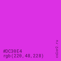 Цвет #DC30E4 в цветовой модели RGB обозначается тремя октетами (220, 48, 228) в десятичном формате и #DC30E4 в шестнадцатиричном (hex) формате, которые являются интенсивностью красного 220 (hex DC), интенсивность зелёного 48 (hex 30) и интенсивность синего 228 (hex E4).