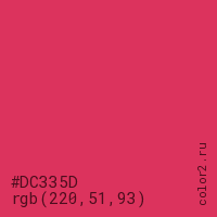Цвет #DC335D в цветовой модели RGB обозначается тремя октетами (220, 51, 93) в десятичном формате и #DC335D в шестнадцатиричном (hex) формате, которые являются интенсивностью красного 220 (hex DC), интенсивность зелёного 51 (hex 33) и интенсивность синего 93 (hex 5D).