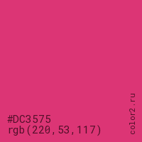 Цвет #DC3575 в цветовой модели RGB обозначается тремя октетами (220, 53, 117) в десятичном формате и #DC3575 в шестнадцатиричном (hex) формате, которые являются интенсивностью красного 220 (hex DC), интенсивность зелёного 53 (hex 35) и интенсивность синего 117 (hex 75).