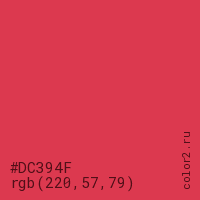 Цвет #DC394F в цветовой модели RGB обозначается тремя октетами (220, 57, 79) в десятичном формате и #DC394F в шестнадцатиричном (hex) формате, которые являются интенсивностью красного 220 (hex DC), интенсивность зелёного 57 (hex 39) и интенсивность синего 79 (hex 4F).