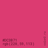 Цвет #DC3B71 в цветовой модели RGB обозначается тремя октетами (220, 59, 113) в десятичном формате и #DC3B71 в шестнадцатиричном (hex) формате, которые являются интенсивностью красного 220 (hex DC), интенсивность зелёного 59 (hex 3B) и интенсивность синего 113 (hex 71).