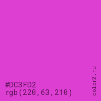 Цвет #DC3FD2 в цветовой модели RGB обозначается тремя октетами (220, 63, 210) в десятичном формате и #DC3FD2 в шестнадцатиричном (hex) формате, которые являются интенсивностью красного 220 (hex DC), интенсивность зелёного 63 (hex 3F) и интенсивность синего 210 (hex D2).