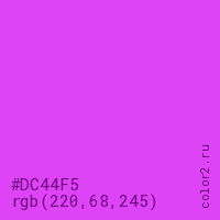 Цвет #DC44F5 в цветовой модели RGB обозначается тремя октетами (220, 68, 245) в десятичном формате и #DC44F5 в шестнадцатиричном (hex) формате, которые являются интенсивностью красного 220 (hex DC), интенсивность зелёного 68 (hex 44) и интенсивность синего 245 (hex F5).