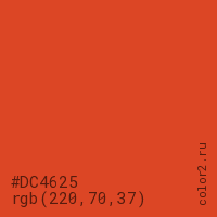Цвет #DC4625 в цветовой модели RGB обозначается тремя октетами (220, 70, 37) в десятичном формате и #DC4625 в шестнадцатиричном (hex) формате, которые являются интенсивностью красного 220 (hex DC), интенсивность зелёного 70 (hex 46) и интенсивность синего 37 (hex 25).