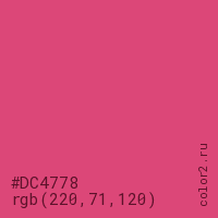 Цвет #DC4778 в цветовой модели RGB обозначается тремя октетами (220, 71, 120) в десятичном формате и #DC4778 в шестнадцатиричном (hex) формате, которые являются интенсивностью красного 220 (hex DC), интенсивность зелёного 71 (hex 47) и интенсивность синего 120 (hex 78).