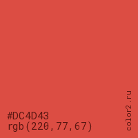 Цвет #DC4D43 в цветовой модели RGB обозначается тремя октетами (220, 77, 67) в десятичном формате и #DC4D43 в шестнадцатиричном (hex) формате, которые являются интенсивностью красного 220 (hex DC), интенсивность зелёного 77 (hex 4D) и интенсивность синего 67 (hex 43).
