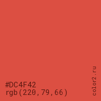 Цвет #DC4F42 в цветовой модели RGB обозначается тремя октетами (220, 79, 66) в десятичном формате и #DC4F42 в шестнадцатиричном (hex) формате, которые являются интенсивностью красного 220 (hex DC), интенсивность зелёного 79 (hex 4F) и интенсивность синего 66 (hex 42).