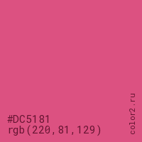 Цвет #DC5181 в цветовой модели RGB обозначается тремя октетами (220, 81, 129) в десятичном формате и #DC5181 в шестнадцатиричном (hex) формате, которые являются интенсивностью красного 220 (hex DC), интенсивность зелёного 81 (hex 51) и интенсивность синего 129 (hex 81).