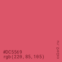 Цвет #DC5569 в цветовой модели RGB обозначается тремя октетами (220, 85, 105) в десятичном формате и #DC5569 в шестнадцатиричном (hex) формате, которые являются интенсивностью красного 220 (hex DC), интенсивность зелёного 85 (hex 55) и интенсивность синего 105 (hex 69).