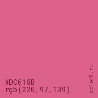 Цвет #DC618B в цветовой модели RGB обозначается тремя октетами (220, 97, 139) в десятичном формате и #DC618B в шестнадцатиричном (hex) формате, которые являются интенсивностью красного 220 (hex DC), интенсивность зелёного 97 (hex 61) и интенсивность синего 139 (hex 8B).